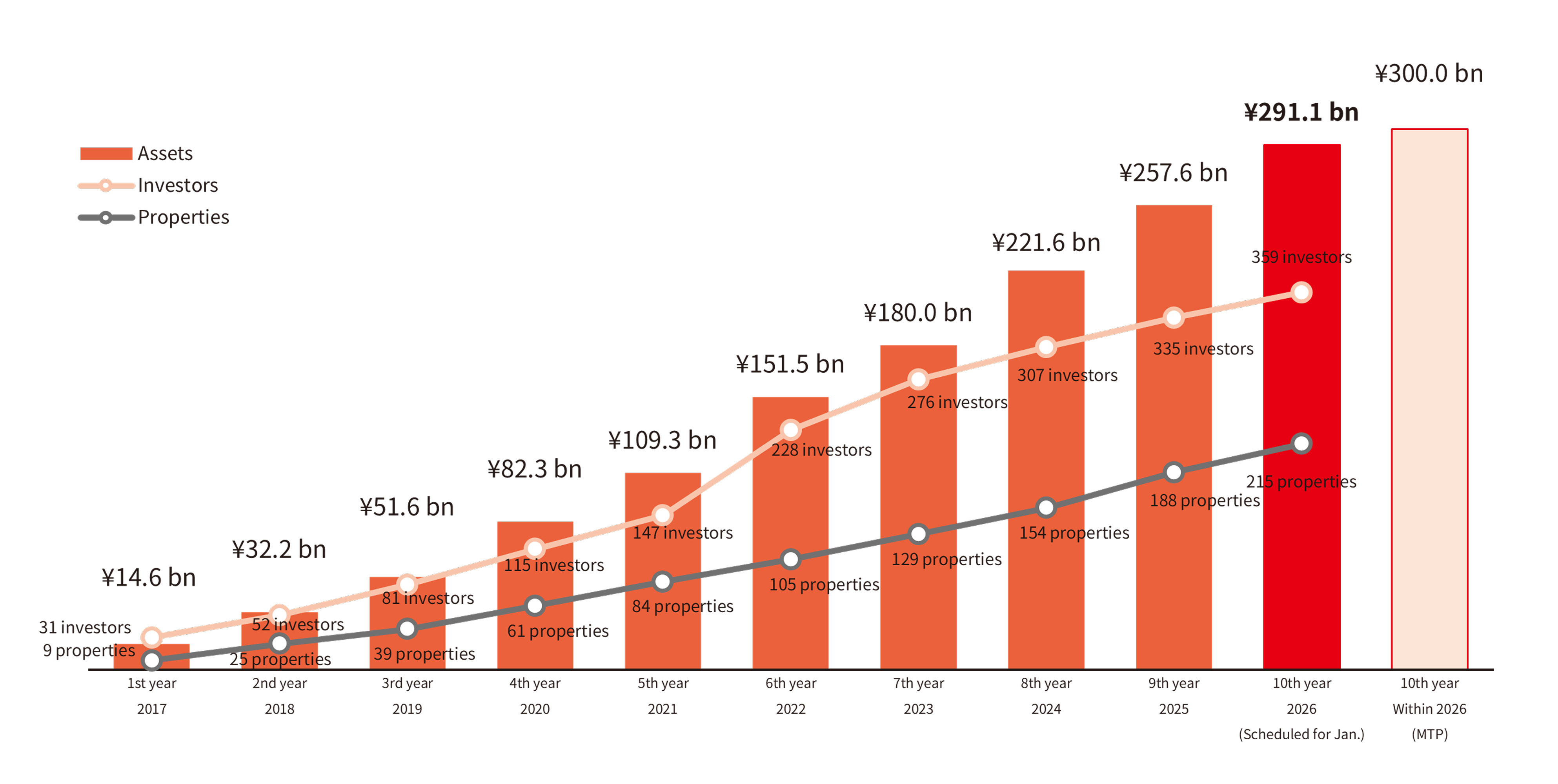 Utilizing sponsor support from JINUSHI Co., Ltd., JINUSHI REIT achieved the initial plan of 100 billion yen of assets in five years after starting operation. JINUSHI REIT now aims to reach 500 billion yen as soon as possible, and we have set a medium-term target of 300 billion yen as a milestone.
