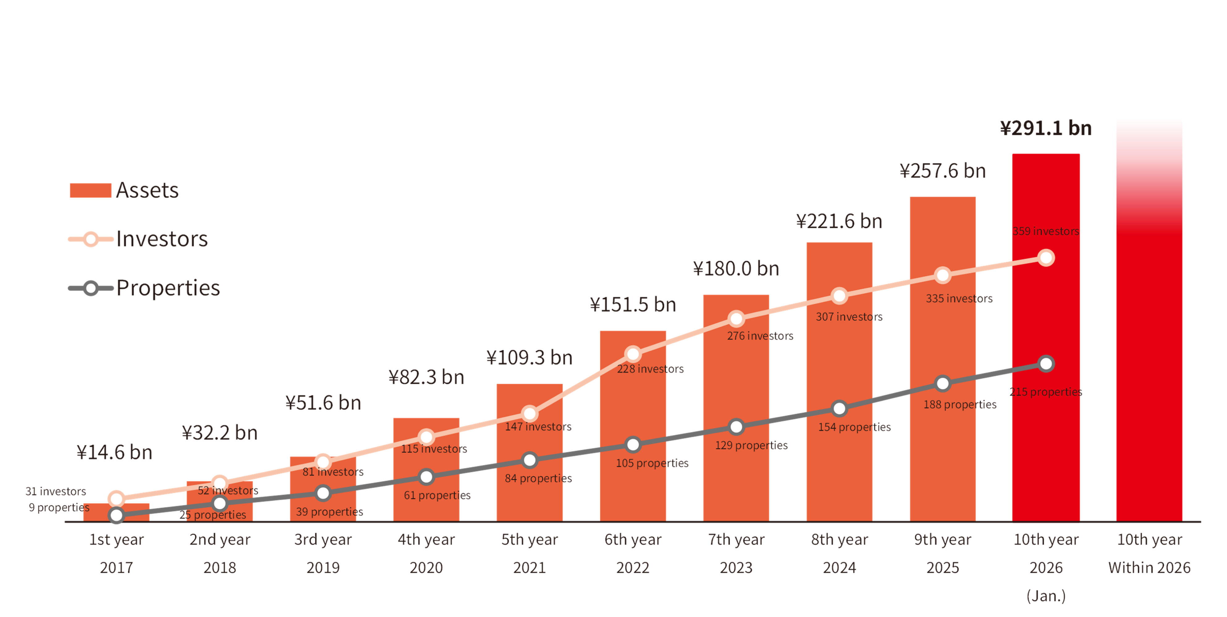In January 2026, JINUSHI REIT has completed its 10th consecutive capital increase, bringing assets under management to ¥291.1 billion. It aims to achieve AUM of ¥300.0 billion, and to reach ¥500.0 billion at an early stage thereafter.