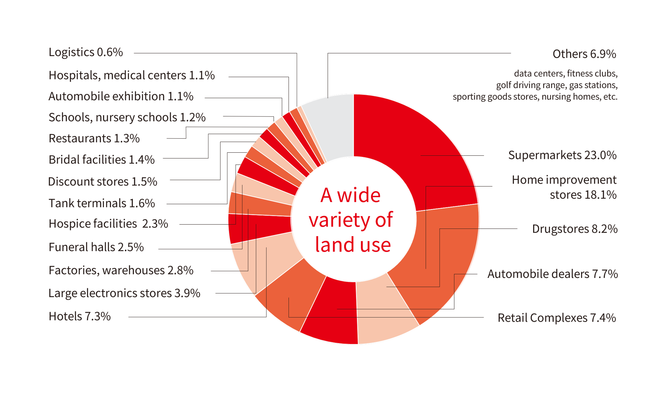 Upon changing our company name to JINUSHI Co., Ltd. in January 2022, we are promoting the diversification of tenant industries. In addition to industries that handle daily necessities such as supermarkets, home improvement stores, drug stores, and large electronics stores, the JINUSHI BUSINESS is expanding to tenants that handle social infrastructure such as hospices, nursing homes, schools, and nursery schools.