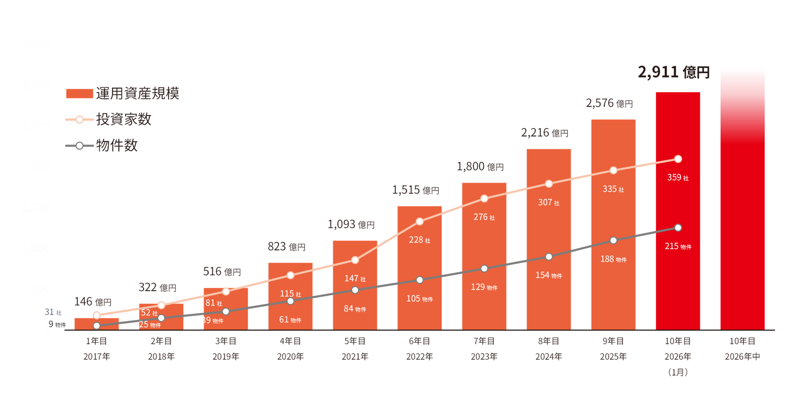 2026年1月には、10年連続の増資を実現し、資産規模は2,911億円に到達しました。中期目標の3,000億円を通過点に、早期に5,000億円の達成を目指します。